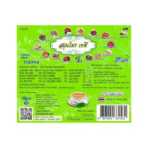 Embrace the essence of Thai herbal heritage with our New Recipe Tapee Tea, presented in convenient sachets. This unique blend features 15 distinct, organically sourced herbs, drawing inspiration from generations of traditional Thai wellness practices.